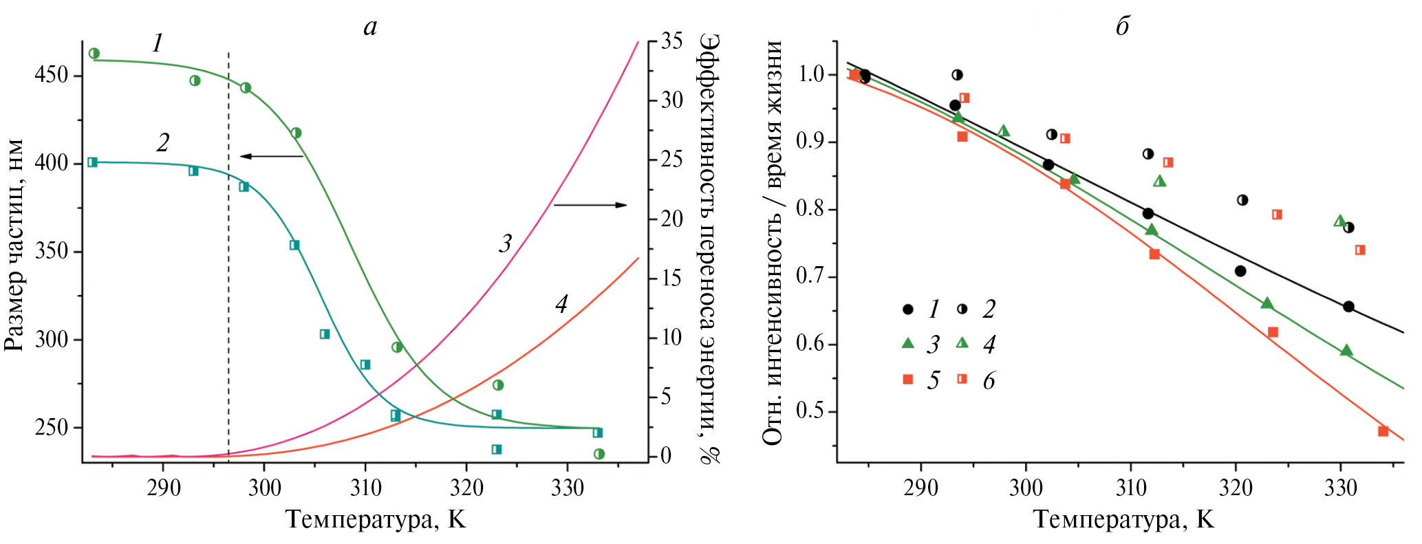Рис. 4. Влияние температуры на уменьшение размера биополимерных частиц (1), композита с эритрозином B (2) и на рост вклада от общего переноса энергии КТ-КТ, КТ-erB (3) и переноса энергии только за счет КТ-erB (4) в тушение интенсивности ФЛ (а). Температурное тушение интенсивности (I) и среднего времени жизни (τ) ФЛ квантовых точек CdSe/ZnS в трех исследуемых системах (б): вода (черные круги, 1 — I, 2 — τ), композит (зеленые треугольники, 3 — I, 4 — τ), композит с erB (красные квадраты, 5 — I, 6 — τ)