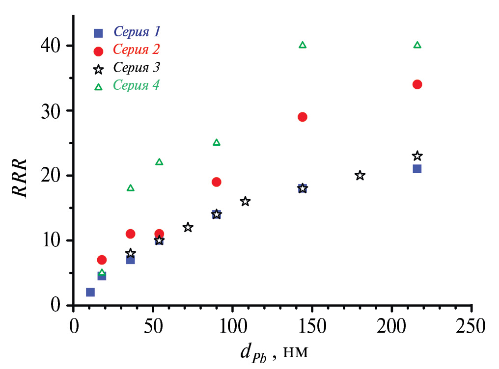 На рис. 3 представлены зависимости RRR от толщины Pb-слоя для всех серий образцов. Согласно рис. 3, с уменьшением толщины Pb-слоя уменьшается RRR, что характерно для всех серий образцов. Независящий от температуры вклад от рассеяния на дефектах ρdef складывается из рассеяния в объеме пленки и на поверхности. При малых толщинах рассеяние на поверхности пленки становится доминирующим и отношение RRR падает. Это хорошо согласуется с ростом критического поля сверхпроводящих пленок свинца при уменьшении толщины [40].