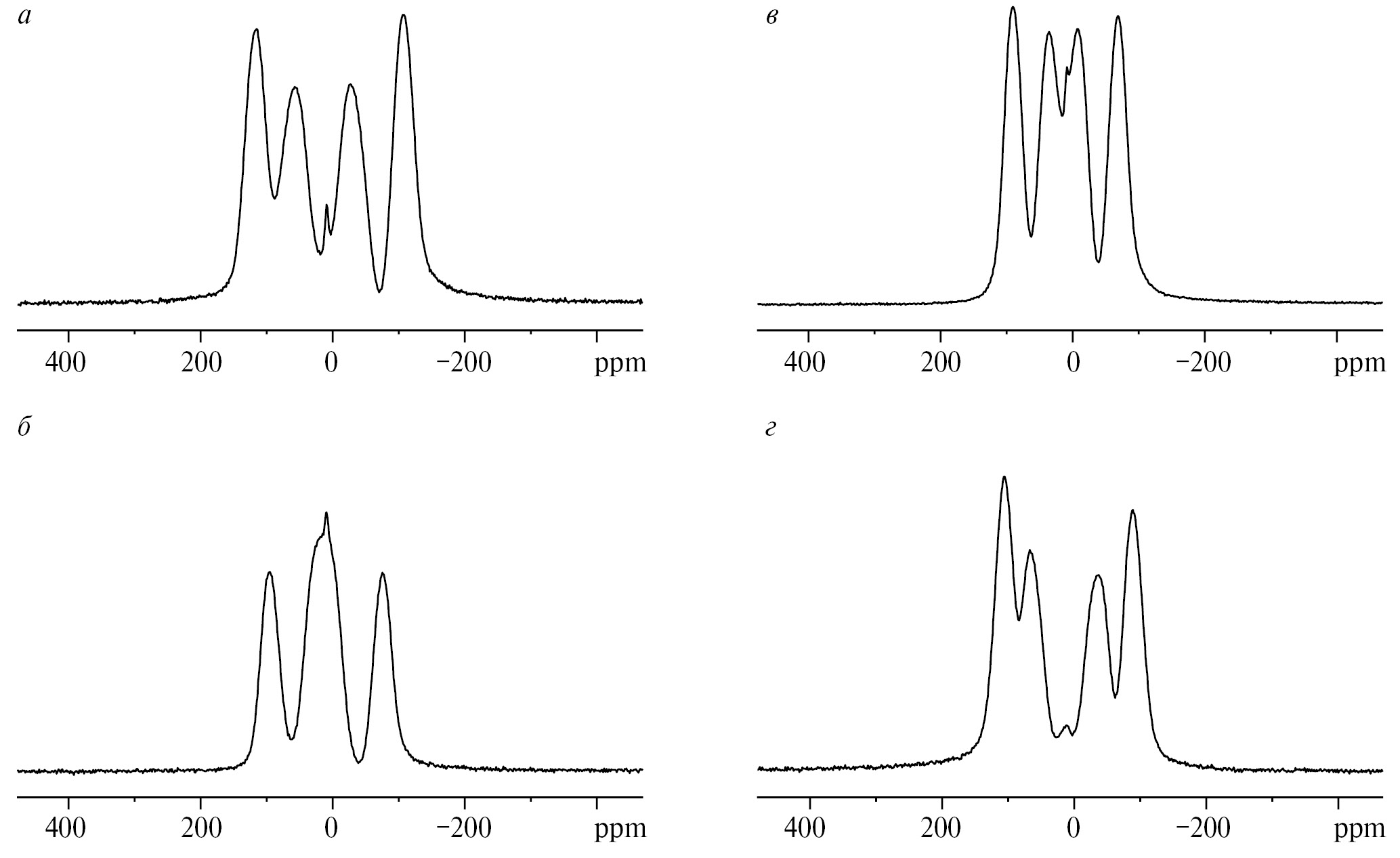 Позиции, обозначенные далее, как Pos1, Pos2, Pos3 и Pos4, соответствуют спектрам, показанным на рис. 2а, 2б, 2в и 2г соответственно. Расщепления приведены в табл. 1. Для Pos2 в МК-экспериментах был проанализирован только внешний дублет, который дает различимое диполь-дипольное расщепление.