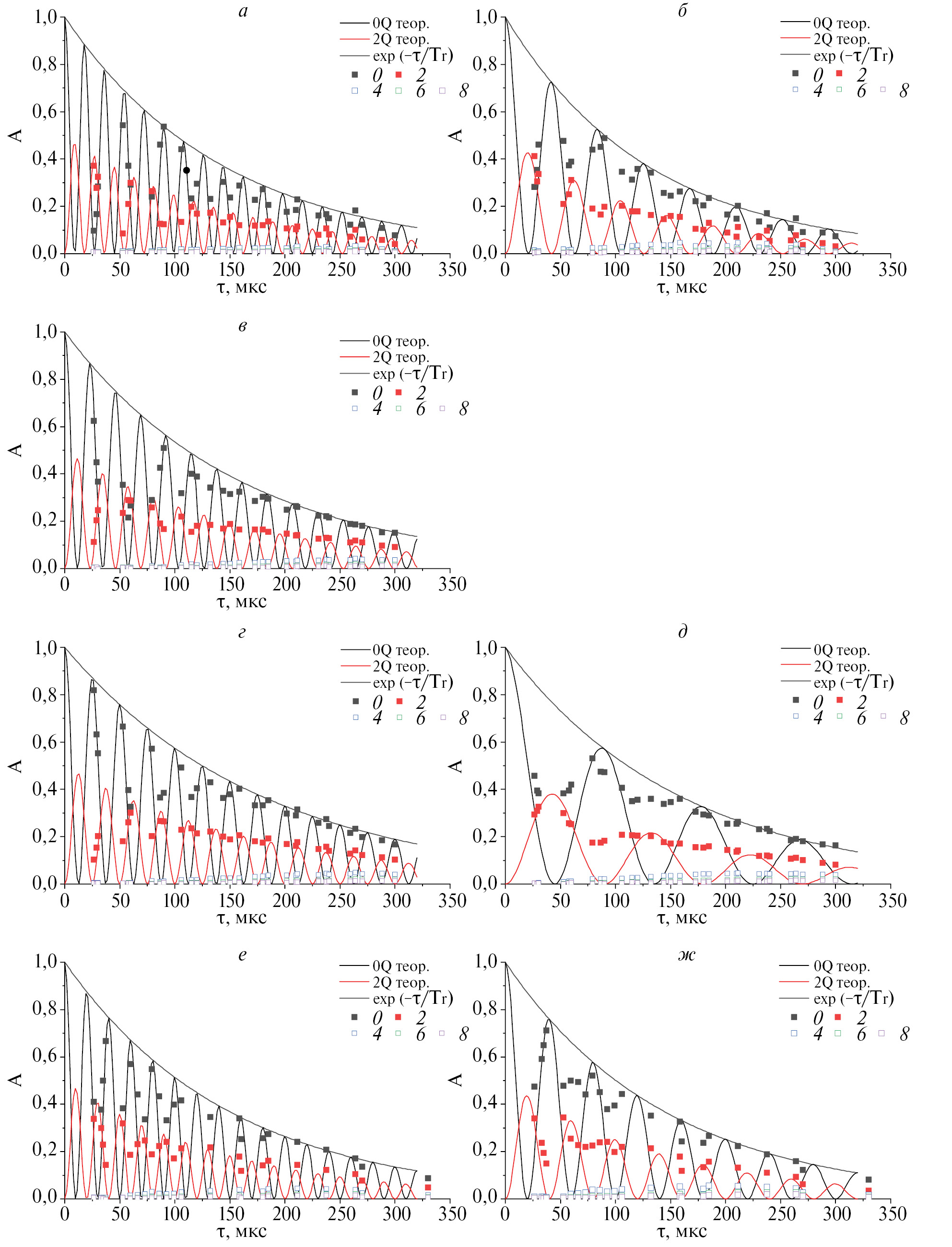 Рис. 5. Интенсивности МК когерентностей ЯМР 1H в кристалле гипса при различных ориентациях, соответствующих различным расщеплениям, Δv, в спектрах 1H: (а) 89.4 кГц (Pos1), (б) 33.8 кГц (Pos1), (в) 68.5 кГц (Pos2), (г) 63.2 кГц (Pos3), (д) 18 кГц (Pos3), (е) 77.1 кГц (Pos4), (ж) 40.7 кГц (Pos4). Теоретические кривые для 0-го и 2-го порядков показаны сплошными линиями. Экспоненциальная огибающая exp(–τ/Tr) показана черной сплошной линией для когерентности 0-го порядка.