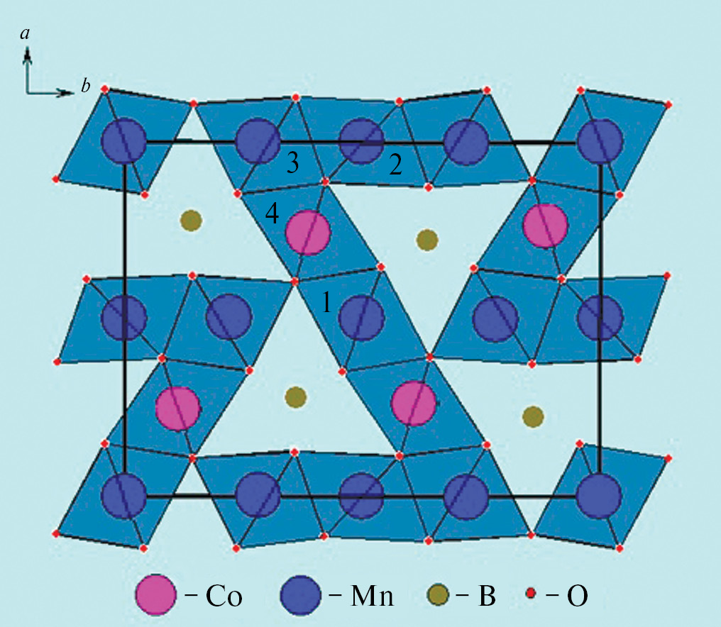 Оксибораты с общей химической формулой (MeMe’)3BO5 в большинстве имеют кристаллическую структуру людвигита и относятся к пространственной группе Pbam (55) [1, 2]. Оксибораты со структурами типа людвигита (структурная формула M’2M’’BO5, где Mʹ и Mʺ — ионы металлов с валентностью 2+ и 3+ соответственно) обладают чрезвычайно необычными магнитными свойствами, обусловленными случайным распределением магнитных ионов, смешанной валентностью и сильными электронными корреляциями. Эти свойства обусловлены зигзагообразными стенками в их кристаллической структуре, образованными ионами металлов различной валентности. Другой причиной является наличие четырех неэквивалентных структурных положений, которые могут быть заняты до двенадцати магнитными ионами на элементарную ячейку. Химическая формула и условие электронейтральности людвигита предполагают соотношение между двух- и трехвалентными элементами как 2 к 1, которые могут занимать четыре возможных положения в центре искаженного октаэдра.