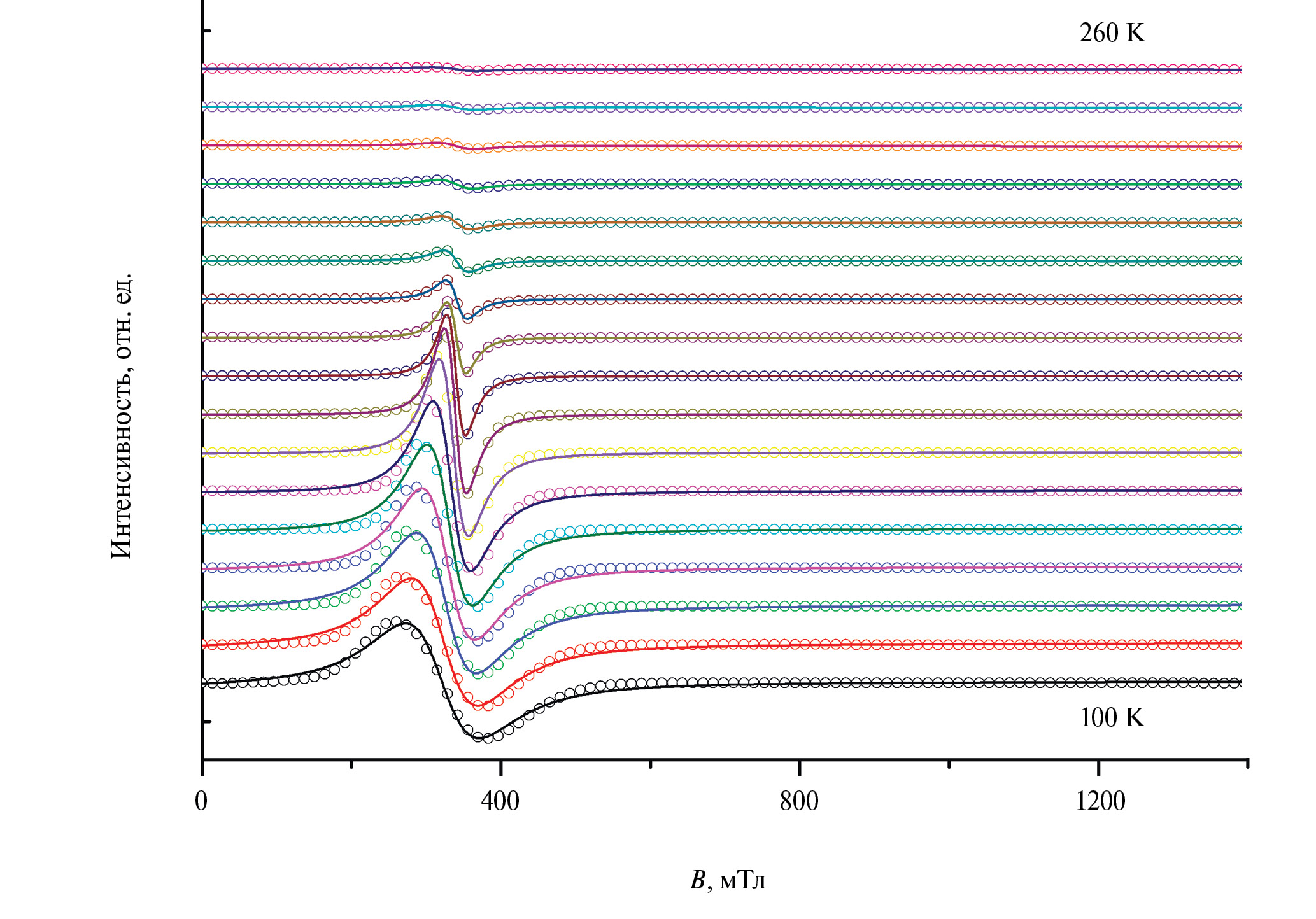 Рис. 3. Температурная зависимость спектров ЭПР-порошка Mn2.25Co0.75BO5 в Х-диапазоне (9.4 ГГц), спектры представлены между 100 и 260 К с шагом 10 К. Экспериментальные спектры показаны открытыми символами, сплошные линии — аппроксимация по формуле (1).