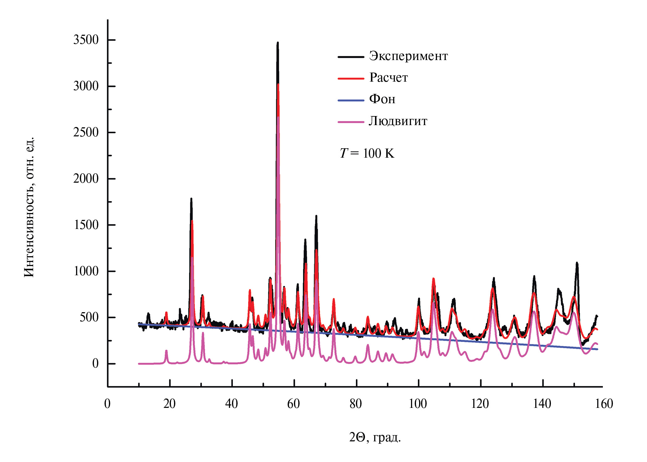Для анализа дифрактограммы использовалась программа MAUD (Materials Analysis Using Diffraction) v.2.992 [23]. Для подгонки кристаллографических параметров использовали структуру людвигита, определенную в 2019 году, которая была опубликована в статье [24]. Были определены параметры элементарной ячейки, позиции атомов и подтверждена пространственная группа Pbam. При аппроксимации нейтронограмм заселенности позиций ионов кислорода и бора не менялись. На дифрактограмме имеется несколько нераспознанных пиков при углах 2θ = 12.7, 23.06, 32.4, 39.7 градусов, которые, как мы предполагаем, связаны с магнитным упорядочением. Интенсивность этих пиков более чем на порядок меньше интенсивности основных пиков людвигита, и все же они вносят свой вклад в ошибки измерения. Кроме того, при фитировании не учитывалась аппаратная ошибка, поэтому некоторые параметры тепловых колебаний имеют отрицательные значения, что влияет также на величины ошибок. Тем не менее параметр качества подгонки имеет вполне приемлемую величину: Rwp(%) = 17.43, где