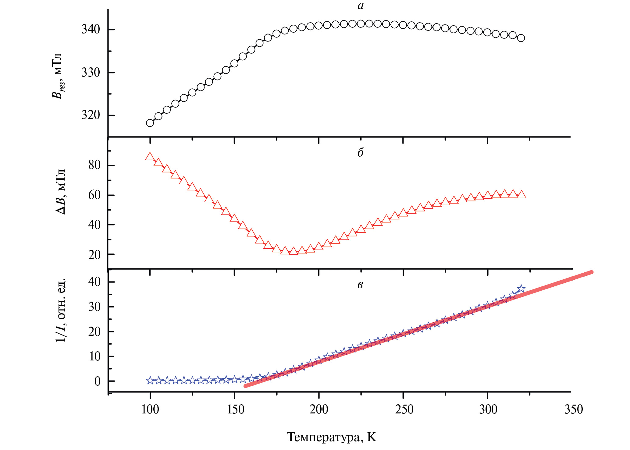 где Bres — положение резонансной линии, ΔB — ширина линии, а α — параметр асимметрии линии. Из аппроксимации формы линии ЭПР по формуле (2) были получены значения эффективного g-фактора, ширины линии и интегральной интенсивности, полученные температурные зависимости которых приведены на рисунке 5.