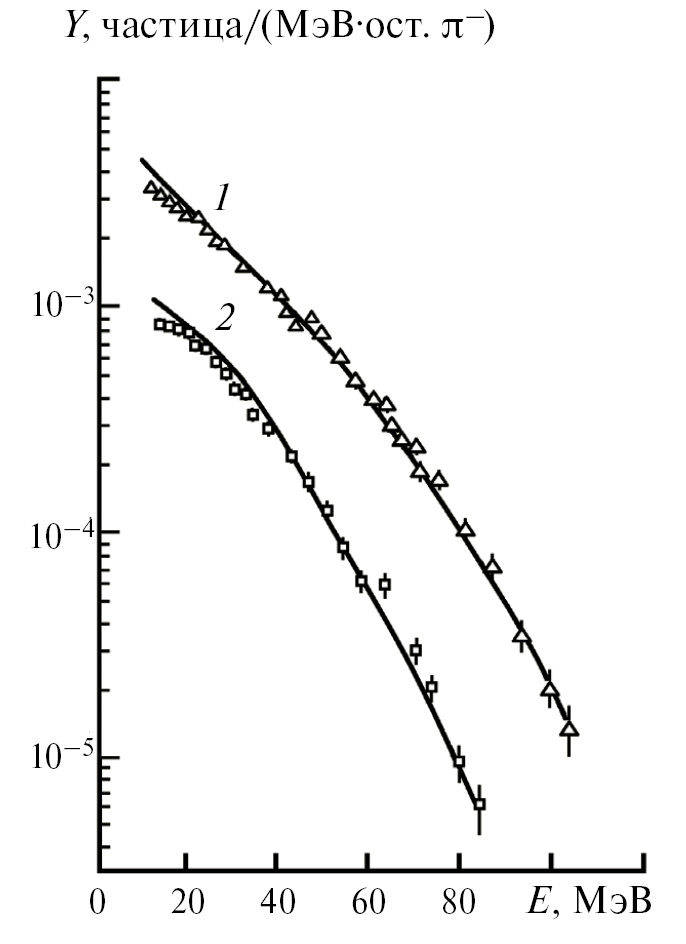 На рис. 1 показаны расчетные и измеренные инклюзивные спектры сложных частиц дейтронов и тритонов. В таблице 1 представлены выходы этих частиц, наряду с выходами протонов [3].