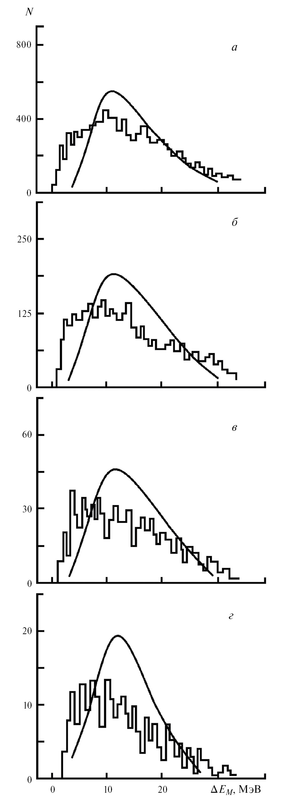 Рис. 3. Экспериментальные и расчетные спектры энерговыделений в “живой” мишени при регистрации тритонов в энергетических интервалах: а) 10—20; б) 20—30; в) 30—40; г) 40—50 МэВ. Кривые — расчет, гистограммы — результаты эксперимента.