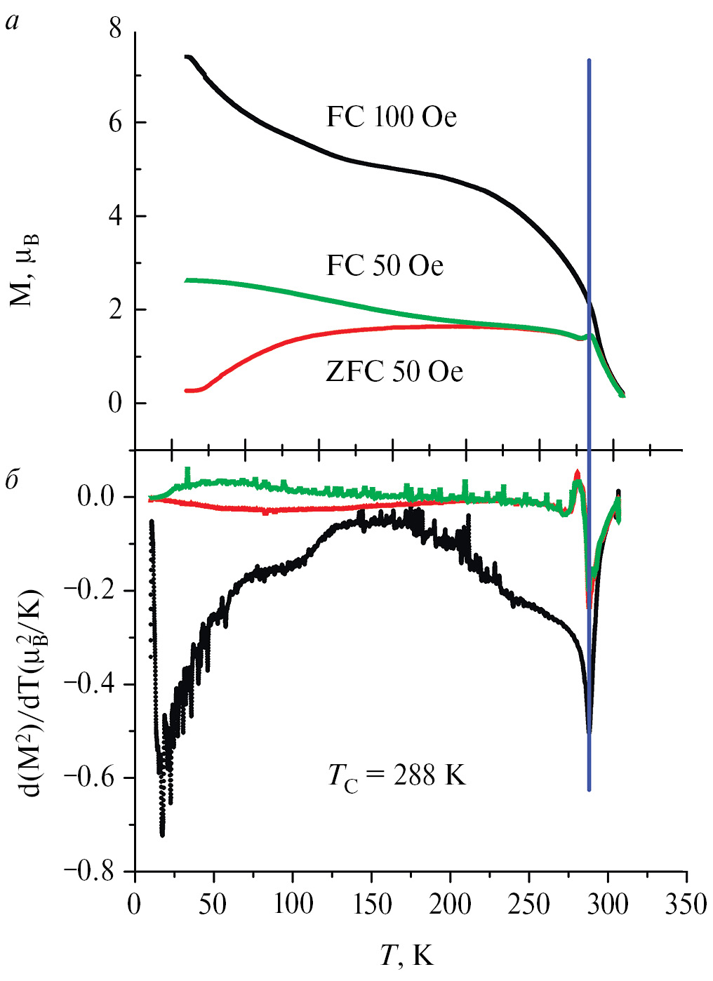 Согласно температурным зависимостям производной квадрата намагниченности, температура ферримагнитного фазового перехода, исходя из результатов магнитометрии, составила TC = 288 K.