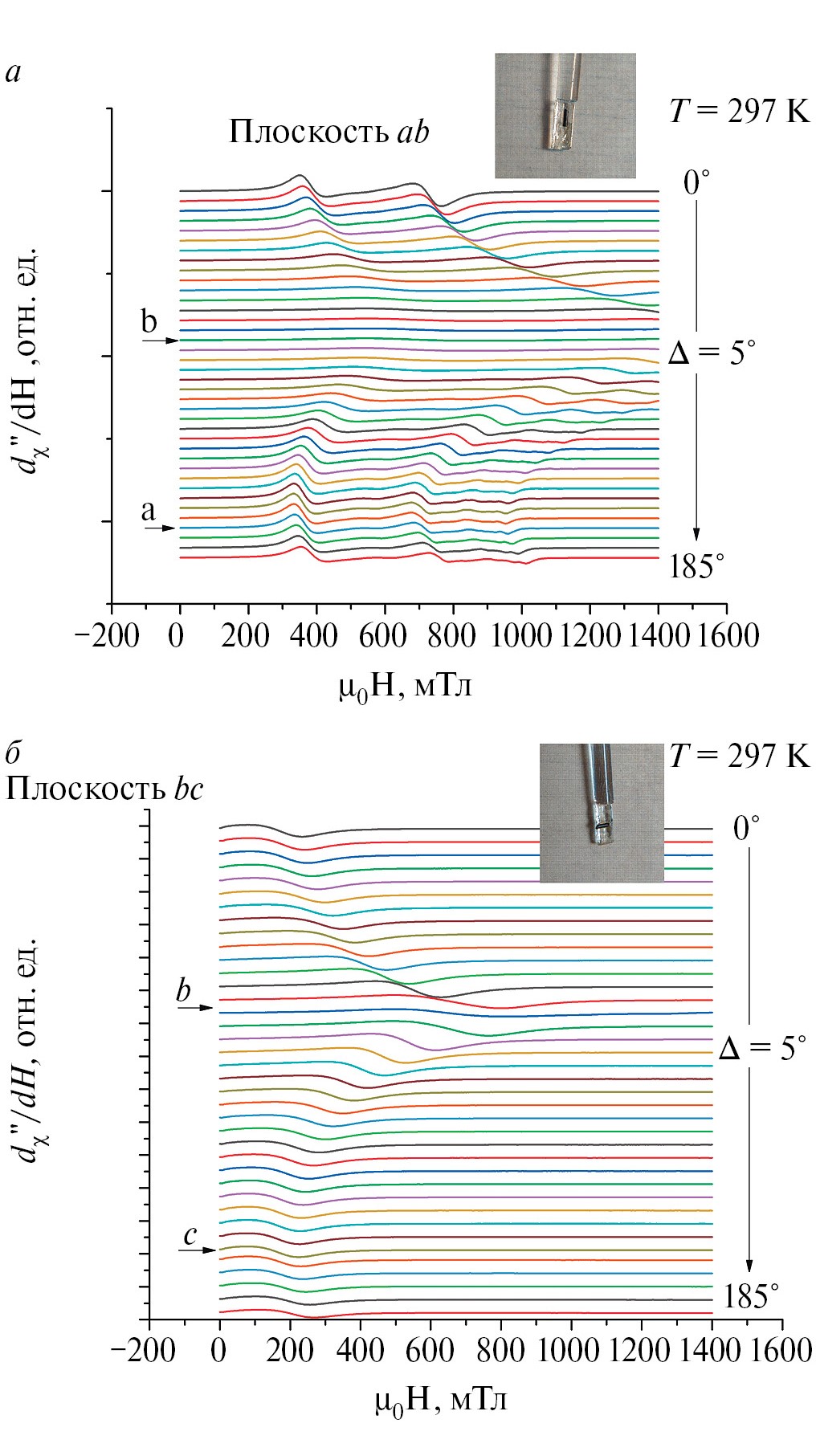 Зависимость спектров электронного спинового резонанса от угла измерялись в двух ориентациях: 1) внешнее магнитное поле лежит в плоскости ab (рис. 3а); 2) внешнее магнитное поле лежит в плоскости bc (рис 3б).
