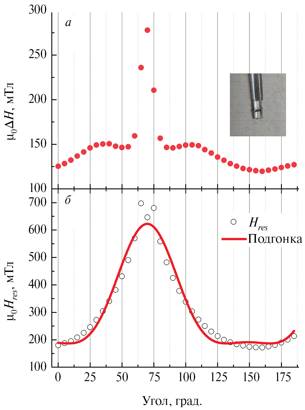 где HA1 = K1/M0 и HA2 = K2/M0 — поля анизотропии, а H0z — проекция магнитного поля Hz на направление M0. Из аппроксимации угловой зависимости резонансного значения магнитного поля были получены следующие параметры: H0z = 15.2 ± 0.2 мТл; HA1 = 4.9 ± 0.2 мТл; HA2 = –1.8 ± 0.2 мТл.