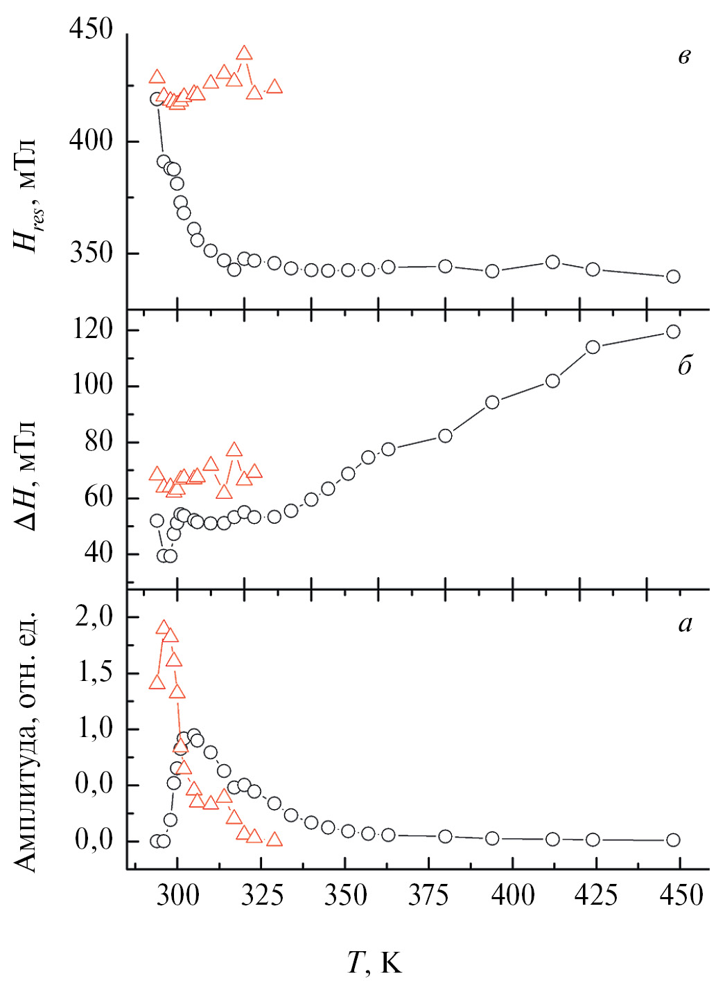 Рис. 6. Температурная зависимость интегральной интенсивности (а), ширины линии ЭСР (б) и резонансного поля (в) для Fe1.1Ga0.9O3 в плоскости ac.