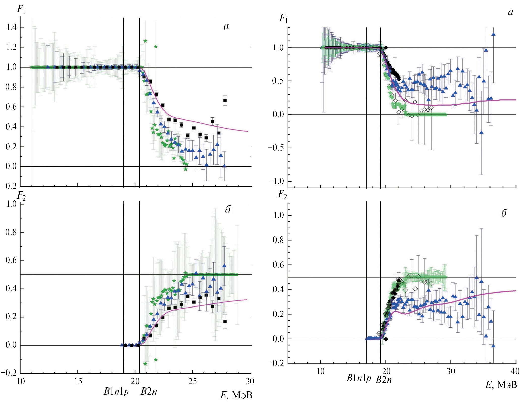 Отношения F1,2эксп, определенные по данным для сечений выхода и сечений парциальных реакций на ядрах 51V и 59Co, полученных описанным выше способом, представлены на рис. 2. Хорошо видно, что к достоверности обсуждаемых данных в случаях обоих ядер могут быть предъявлены серьезные претензии. Во-первых, следует отметить огромные расхождения между Fiэксп [9] и Fiтеор [13], намного превышающие аналогичные расхождения данных в случаях обоих ядер, полученных на пучках аннигиляционных фотонов [4, 5, 12], которые были интерпретированы как недостоверные [1, 2, 8]. Во-вторых, о недостоверности обсуждаемых данных, полученных для обоих ядер на пучках тормозного g-излучения, свидетельствует то, что отношения F1 выходят на физически недостоверное значение 0, а соответствующие отношения F2 — на значение 0.50 при очень малых значениях энергии налетающих фотонов. Это означает, что при больших энергиях в экспериментах на пучках тормозного g-излучения не были зарегистрированы нейтроны из реакции (g, 1n), хотя, как отмечалось выше, нейтроны из этой реакции наблюдались до энергии налетающих фотонов ~40 МэВ. Такое недостоверное существенное занижение сечения реакции (g, 1n) при энергиях фотонов, больших отмеченных выше значений (24.5 и 21.5 МэВ), приводит, к недостоверной интерпретации сечения выхода нейтронов как σ(γ, xn) = 2σ(γ, 2n). В результате сечение реакции (g, 2n) оказывается существенно переопределенным — недостоверно завышенным. Все сказанное выше свидетельствует о том, что экспериментальные данные, полученные для ядер 51V и 59Co в экспериментах на пучках тормозного γ-излучения, не удовлетворяют физическим критериям и, следовательно, не являются достоверными.