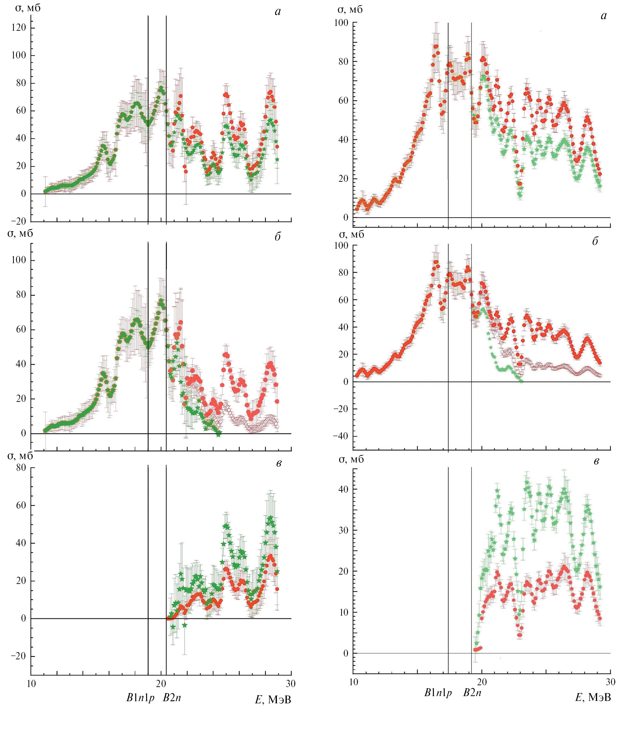 Полученные для обоих ядер описанным выше методом сечения реакций s(g, 1n) и s(g, 2n) использованы для анализа их достоверности с помощью экспериментально-теоретического метода оценки [14, 15], с помощью которого были выполнены ранее оценки достоверности сечений парциальных реакций, полученных для ~50 ядер в экспериментах на пучках квазимоноэнергетических аннигиляционных фотонов [6]. Использовались объективные физические критерии достоверности [14, 15], основные из которых — отношения сечений конкретных парциальных реакций к сечениям выхода