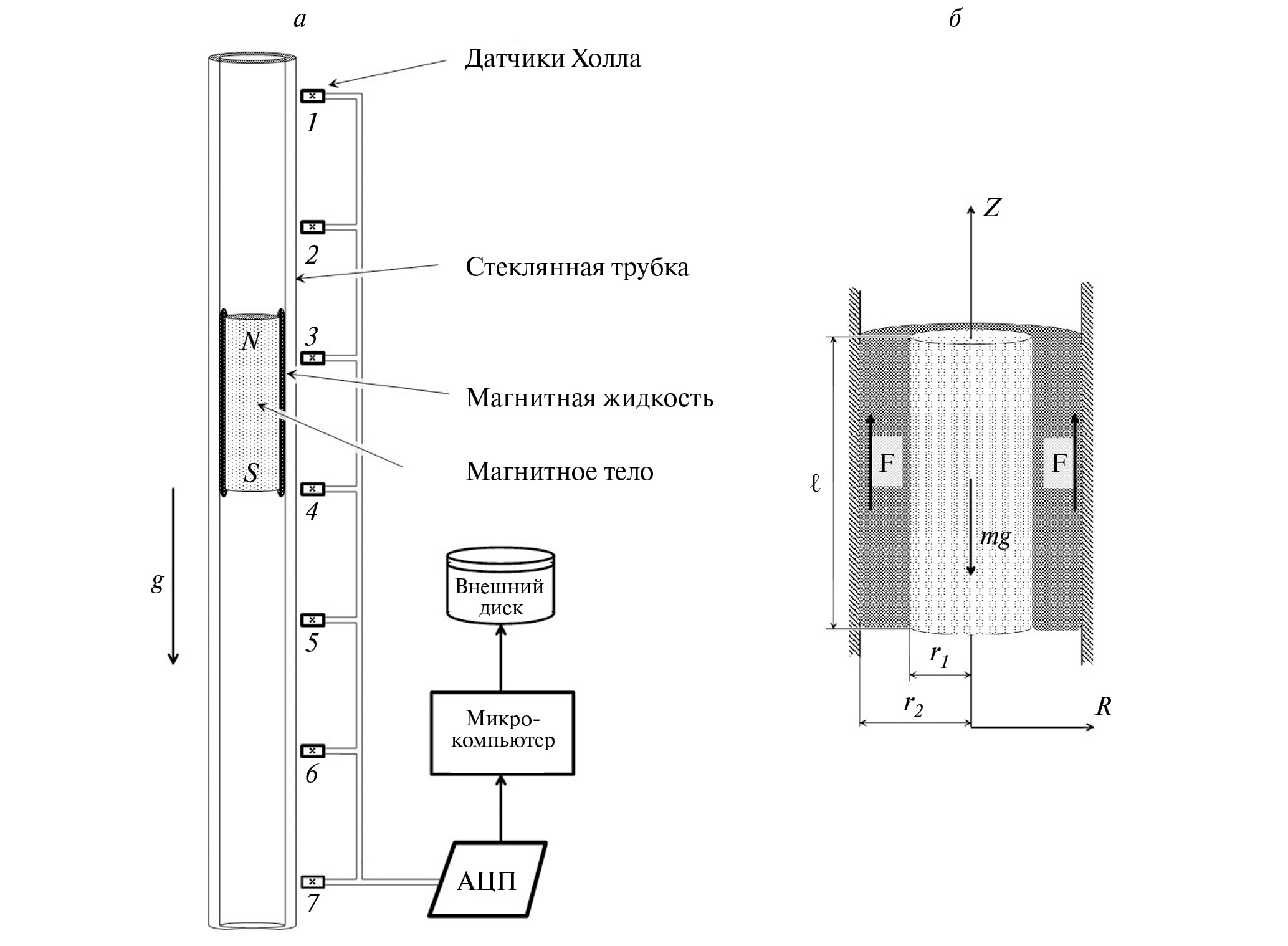 Условие равномерности движения магнита в проекции на вертикальную ось: mg = F, где g — модуль ускорения свободного падения, а m — суммарная масса намагниченного цилиндра и МЖ, равная πr12ρmℓ + π(r22 — r12) ρℓ, где ρm — средняя плотность цилиндрического тела. Сила вязкого трения [33] F = 2πr2ℓη[dυ(r2)/dr] действует со стороны стенок трубки на МЖ. Полученное равенство