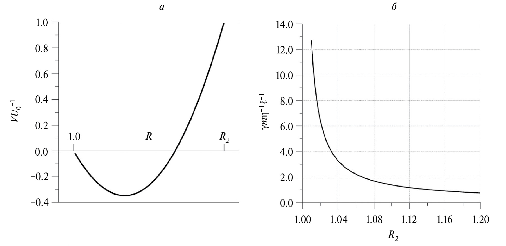 где R2 = r2 / r1 — безразмерный радиус трубки, Ar = ρ(ρm - ρ)r13gη –2, Ga = ρ2r13gη –2 — числа Архимеда и Галилея, выражающие отношение сил тяжести, действующих соответственно на магнитное тело и слой МЖ к силе вязкого трения. Уравнение (3) и условия (4—6) не изменяются кроме как переобозначением физических величин в безразмерном виде. Профиль скорости, удовлетворяющий (3—6) (рис. 5а):