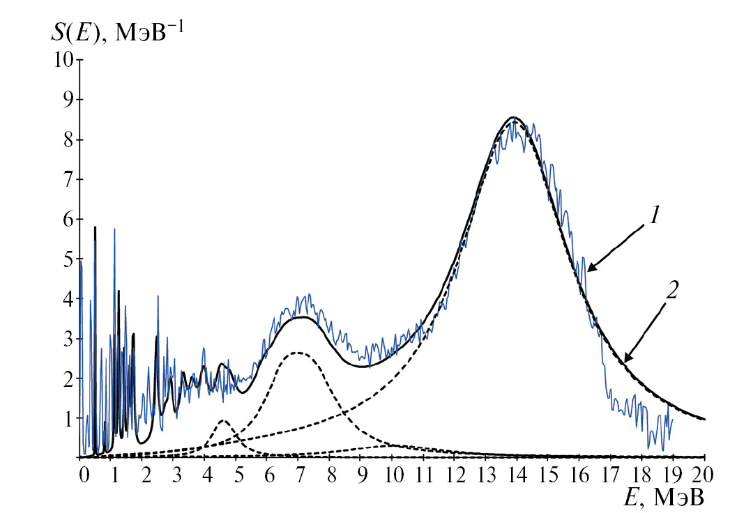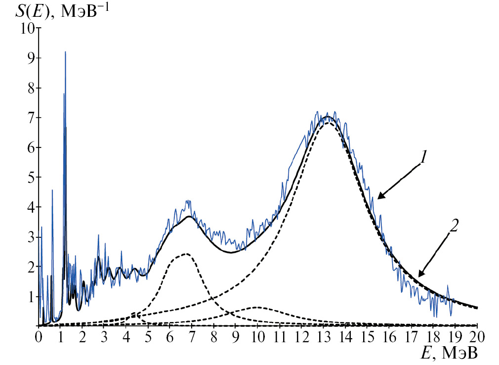 3. Fig. 2. Charge-exchange strength function S(E) of the 128I nucleus. 1 — processed experimental data, 2 — calculation according to the theory of finite Fermi systems.