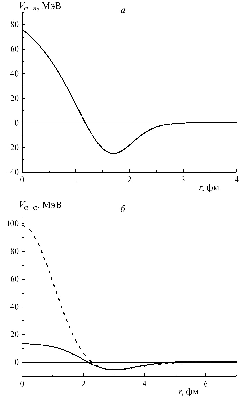 Рис. 1. Графики псевдопотенциала взаимодействия α-частицы с нейтроном (а) и потенциала взаимодействия α-частиц (б): потенциала Али-Бодмера (29) (штриховая кривая) и потенциала (33) с параметрами (42), (43) (сплошная кривая).