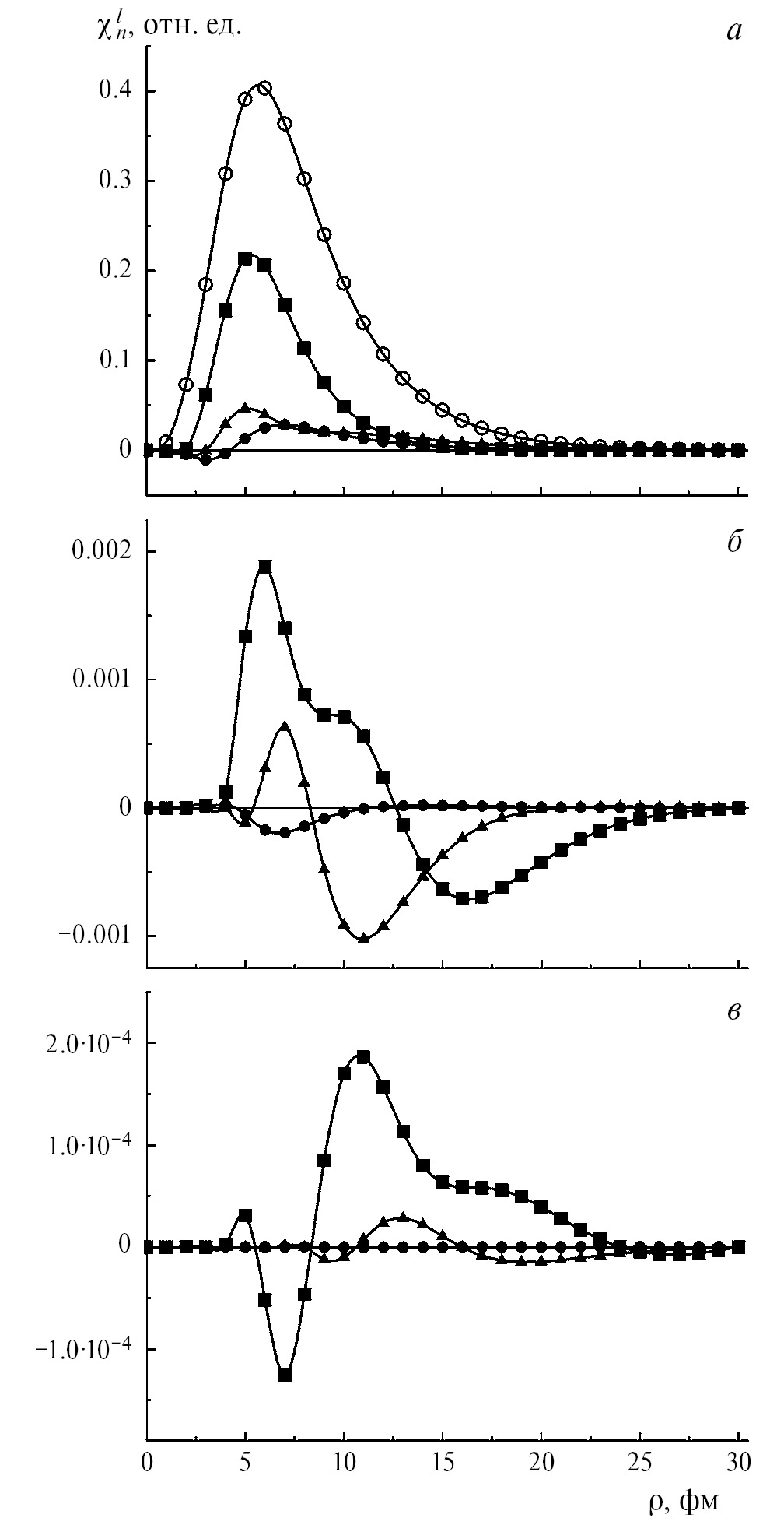 Рис. 4. Примеры решений системы гиперрадиальных уравнений (14) для фм, h = 1 фм,: значения функций в узлах сетки ‒ символы: кружки для , квадраты для , точки для , треугольники для (а); квадраты для , точки для , треугольники для (б); квадраты для , точки для , треугольники для (в); результаты интерполяции кубическими сплайнами между узлами ‒ кривые.