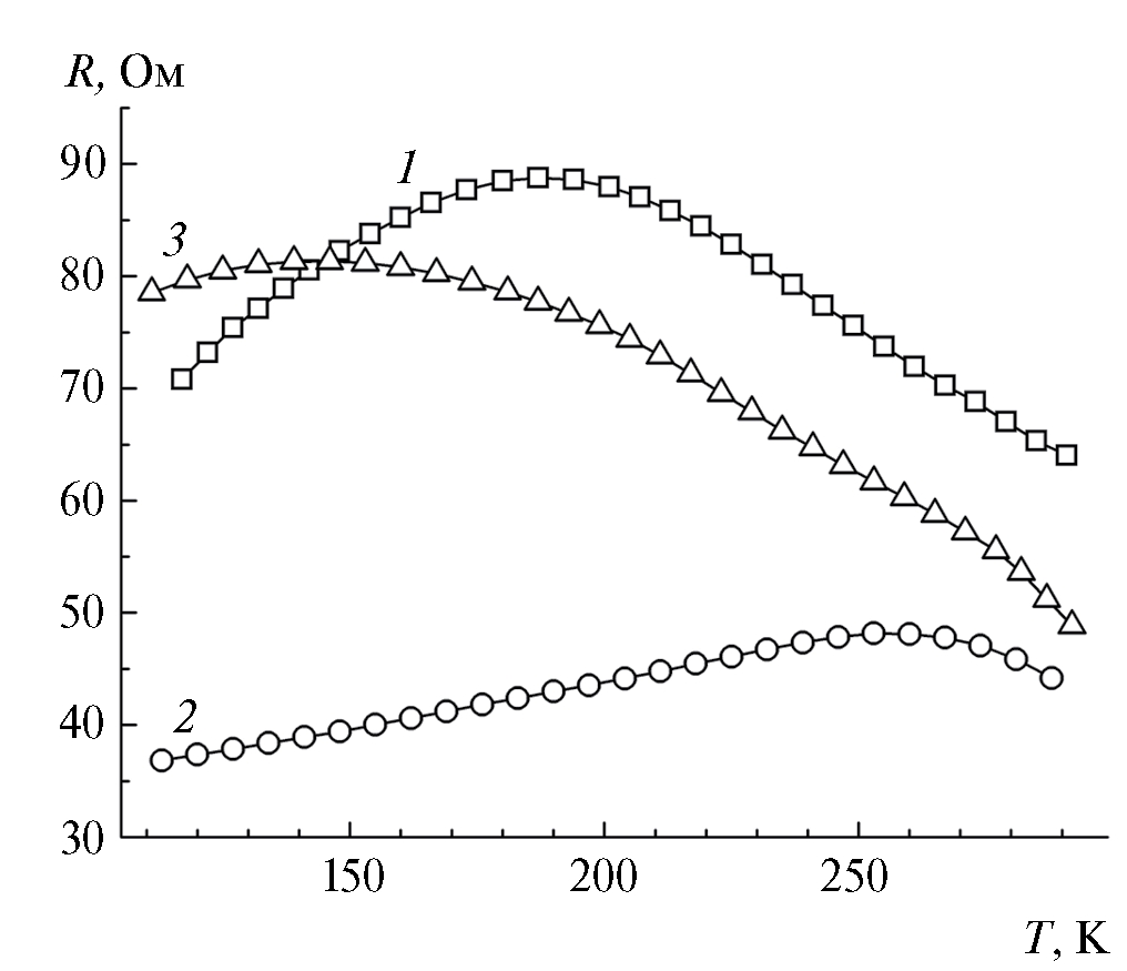 Рис. 2. Температурные зависимости сопротивления манганитов, содержащих (Fe, Zn) — 1, (Fe, Co) — 2, (Fe, Mg) — 3.