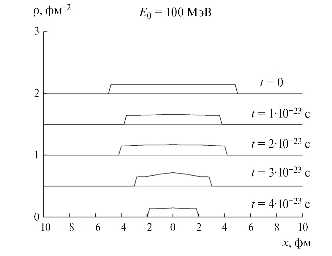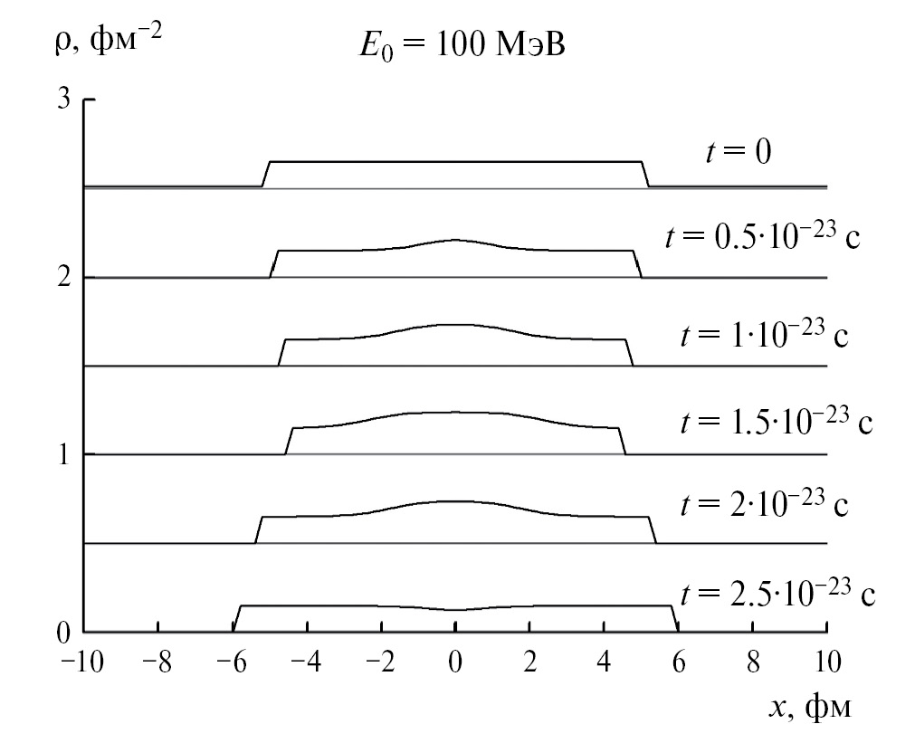 На рис. 1 приведены мгновенные профили плотности столкновения одинаковых ядерных слоев-слэбов при энергии 100 МэВ/нуклон в системе центра масс в различные моменты времени. Можно видеть первоначальное сжатие с образованием hot spot и последующее разрежение в центре.