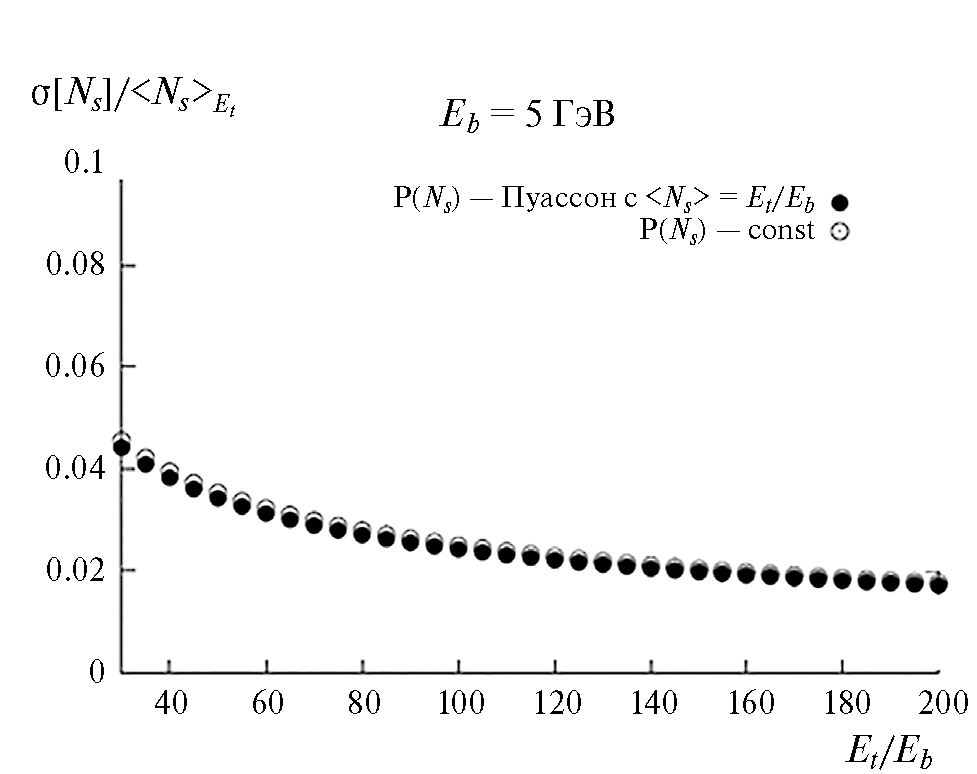 Рис. 6. Относительная погрешность определения Ns для данного Et, с использованием в качестве P(Ns) распределения Пуассона с математическим ожиданием равным Ns = Et / Eb (черные кружки) и равномерного распределения (светлые кружки) при зарегистрированной энергии Et / Eb > 30.