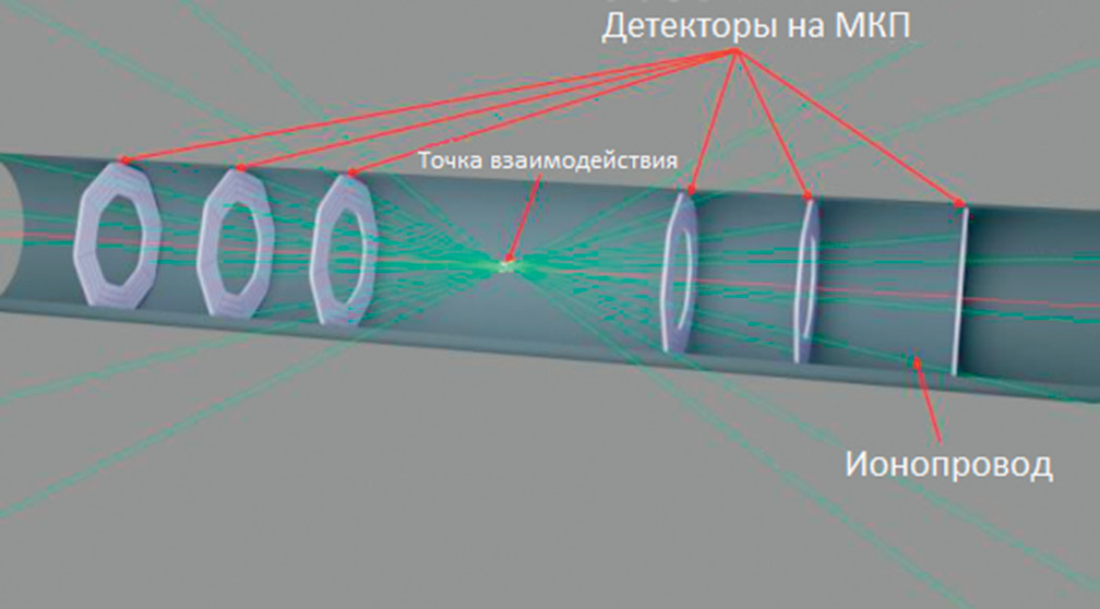 На рис. 1 представлена конфигурация системы, состоящей из шести детекторных колец на микроканальных пластинах расположенных — для первого варианта внутри ионопровода.