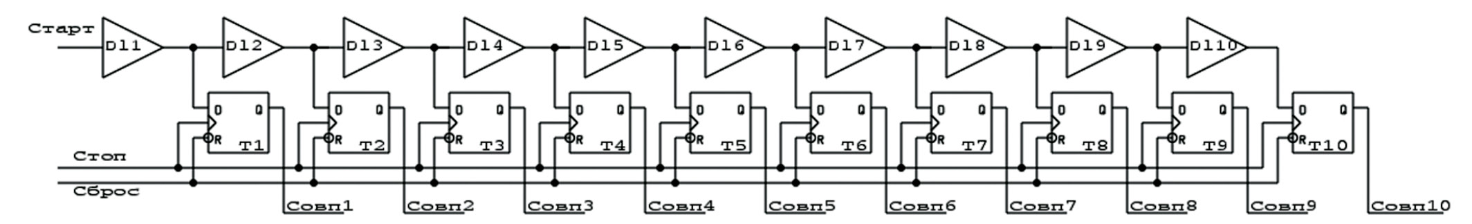 Импульс, поступающий на вход Start, через измерительные линии задержки Dl1–Dl10 распространяется на информационные входы триггеров. Величина задержки в измерительных линиях на каждом из элементов по спецификации ~ 200 пс, при незначительном разбросе (не более 50 пс), что дает возможность получить приемлемую линейность зависимости номер — величина задержки.