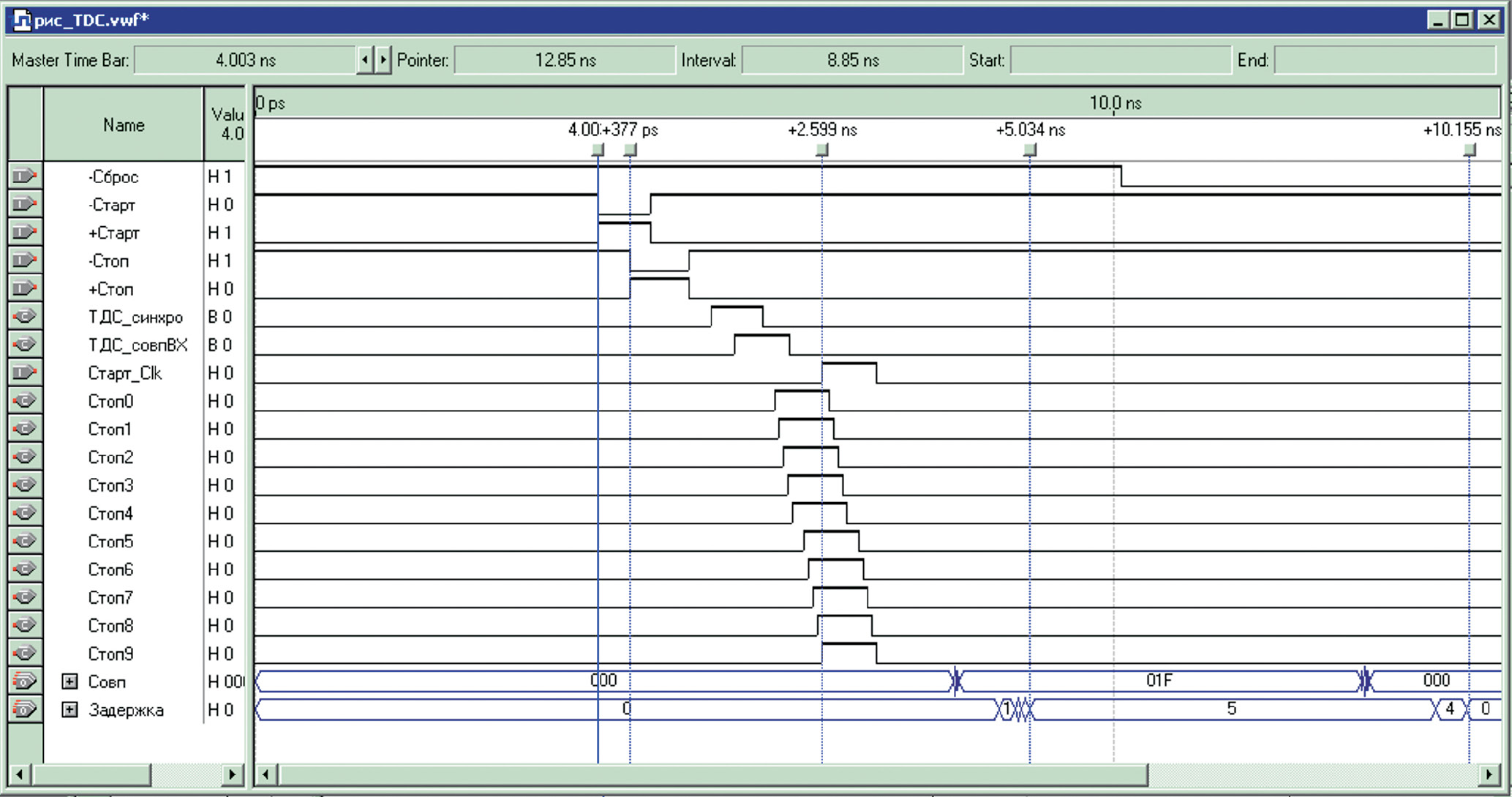 Рис. 6. Диаграмма, полученная в результате моделирования в среде Quartus [13] отработки системой пары импульсов Start-Stop со сдвигом 380 пс.