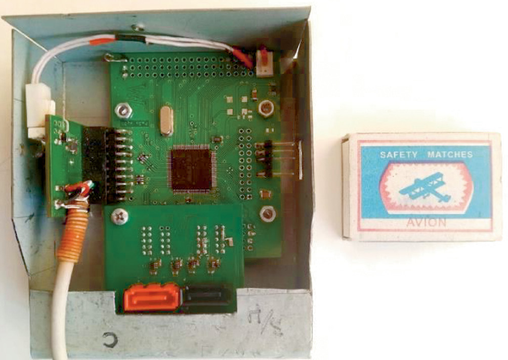 На основе FPGA EPM240 фирмы ALTERA и компараторов ADC MP604 системы обработки сигнала изготовлен 4-канальный прототип модуля электроники быстрого считывания с детектора на МКП (см. рис. 7). Здесь в середине находится кристалл FPGA фирмы ALTERA семейства MAX2. Ниже его расположен блок компараторов и входные разъемы подключения дифференциальных линий (использованы компоненты интерфейса SATA).