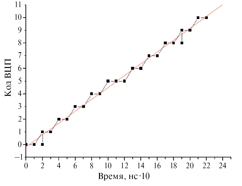 На рис. 10 представлен результат проверки системы быстрого считывания для одного канала в режиме старт-стоп. Изменение кода на выходе ВЦП в зависимости от изменения задержки между каналами стартового и стопового импульсами. Шаг по оси х равен 100 пс, шаг по оси y представляет выходные коды преобразователя ВЦП.