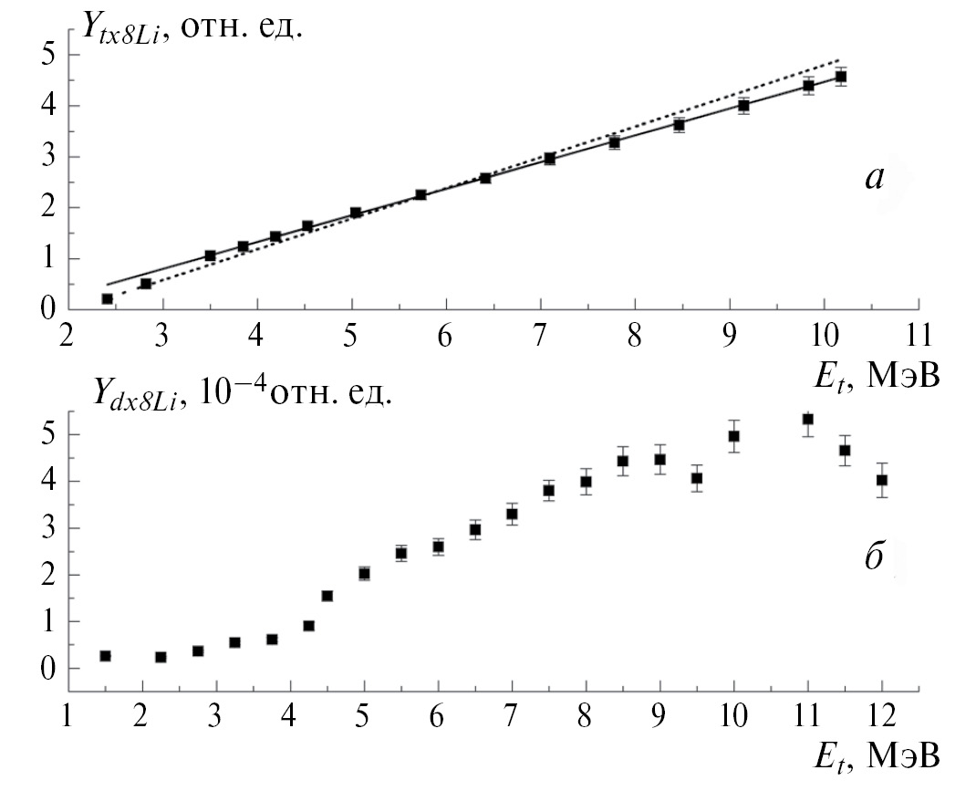 где в этих величинах значки d(t) указывают на облучение толстой бериллиевой мишени дейтронами или тритонами соответственно потоками , n — счетность детектора (имп∙c-1) после времени, отсчитанного от конца облучения, – учитывает распад ядер во время облучения, а – их распад до момента времени измерения счетности, — эффективности регистрации β-частиц из распада 8Li. Во втором множителе (10) все величины для экспериментов с облучениями дейтронами и тритонами одинаковые. Тогда для (без знания их абсолютных значений) для получения можно использовать относительные выходы и , умноженные для удобства на произвольные одинаковые коэффициенты. Калибровочные и основные измерения проводились в различных условиях. Поэтому относительные выходы были представлены в относительных единицах с учетом измеренного отношения с погрешностью 6 %. На рис. 3a и 3б соответственно показаны выходы Ytx8Li (относительная погрешность 4 %) и Ydx8Li (относительная погрешность 7 %), выраженные в одинаковых относительных единицах. В Ydx8Li в качестве аргумента взята средняя энергия из интервала .