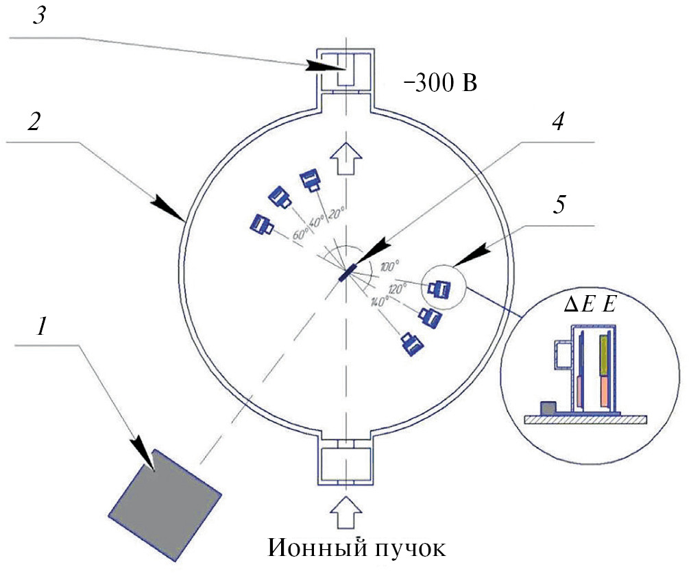 Измерения спектров выполнены на ускорителе ЭГП-10 (РФЯЦ-ВНИИЭФ) с применением спектрометра заряженных частиц с шестью телескопами ΔE-E кремниевых детекторов (рис. 4). Толщина ΔE-детекторов составляла 12—14 мкм, а E-детекторов — 1.2 мм. Основные методические положения измерений опубликованы в [15, 16].