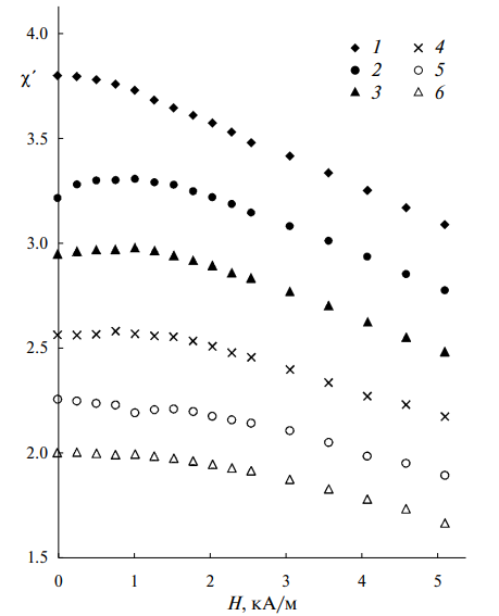 Также были проведены исследования зависимости магнитной восприимчивости магнитной жидкости с различным объемным содержанием немагнитного наполнителя от величины дополнительно приложенного внешнего постоянного магнитного поля, направленного вдоль контейнера с образцом и сонаправленного с измерительным полем. Как оказалось, для однородной магнитной жидкости зависимость носила монотонно убывающий характер (рис. 3, кривая 1). При последовательном увеличении объемного содержания немагнитного наполнителя на данной зависимости появлялся максимум, положение которого практически не зависело от величины напряженности магнитного поля (рис. 3, кривые 2—4). Также было обнаружено, что увеличение объемной концентрации наполнителя приводит к уменьшению относительной величины максимума на зависимости восприимчивости от напряженности магнитного поля. Когда объемная концентрация немагнитного наполнителя превышала определенное значение (δ > 0.5) максимум на зависимости исчезал, и она снова становилась монотонно убывающей (рис. 3, кривые 5 и 6).