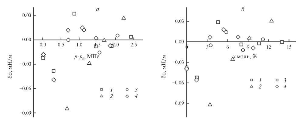 На рис. 2 показаны отклонения экспериментальных данных по поверхностному натяжению σ раствора пропан–метан от значений σeq, рассчитанных по уравнениям (7) и (8) соответственно.