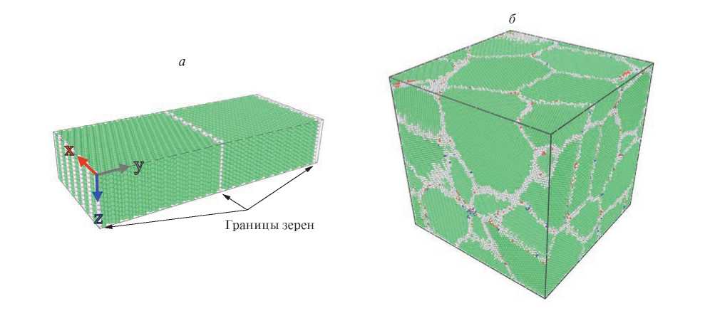 Пример блока моделирования представлен на рис. 1. Структура исследованных границ зерен в модели бикристалла представлена на рис. 2. ГЗ с осью в бикристалле подвергались МД отжигу для того, чтобы проверить термическую устойчивость при конечных температурах, при которых структура ГЗ не разрушается. В ходе этой процедуры выявлено, что все рассматриваемые ГЗ устойчивы до 1200 К в течение всего времени моделирования. В табл. 1 приведены параметры рассматриваемых в настоящей работе ГЗ.