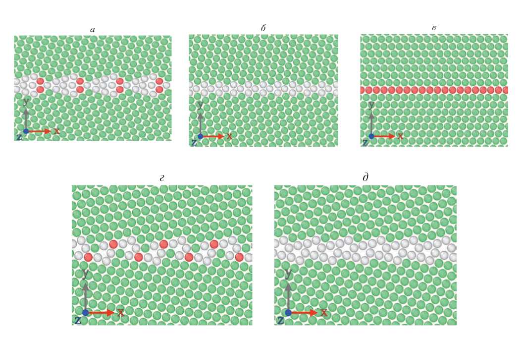 Рис. 2. Структура исследуемых в настоящей работе ГЗ: Σ 9(114) (a), Σ 11(113) (б), Σ 3(111) (в), Σ 11(332) (г), Σ 9(221) (д). Структура визуализирована с помощью анализатора структуры CNA [37] в программе OVITO. Зеленым цветом обозначена ГЦК решетка атомов никеля, синим и красным – ОЦК и ГПУ соответственно. Серым цветом обозначены остальные атомы (зернограничная сетка), красным – решетка ГПУ.