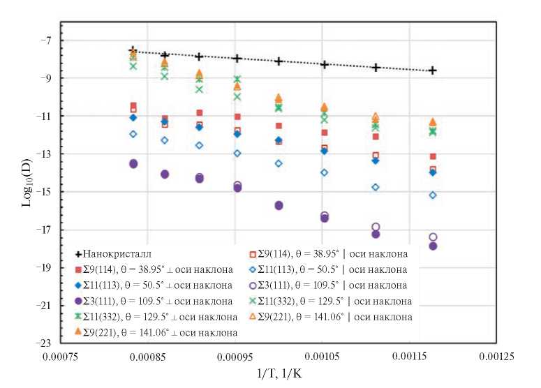 Представленные температурные зависимости коэффициента диффузии (рис. 4) свидетельствуют о более быстрой диффузии в нанокристалле (+), чем в специальных границах. Энергия активации самодиффузии по ГЗ в нанокристалле была значительно меньше (0.56 эВ/атом), чем энергии активации самодиффузии по специальным ГЗ наклона (1.48–2.32 эВ/атом). Различие между диффузией в бикристалле и нанокристалле может объясняться наличием в нанокристалле большой объемной доли тройных стыков.