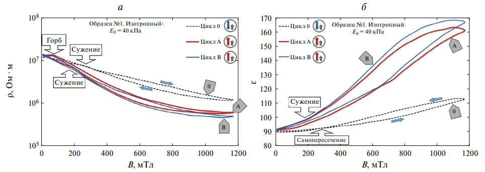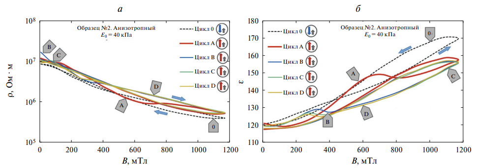 Измерения на всех опытных образцах проходили по одной схеме (рис. 1). Перед переключением направления внешнего поля в параллельную ориентацию проводилось поверочное измерение — цикл 0. В серии последующих измерений отслеживалось изменение формы кривых ρ(B) и ε(B) от цикла к циклу (циклы A, B, C и т. д.). На основании полученной картины делались выводы о протекании адаптационных процессов в материале.