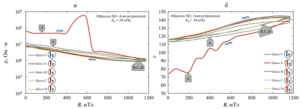 Анизотропный эластомер представлен образцами с более мелкими и более крупными частицами (табл. 2). Различающаяся при этом степень их подвижности, а вместе с этим и эластичности, вкупе со структурированностью расширяет число сценариев поведения (рис. 2 и 3). Так, в цикле 0, образец № 2 демонстрирует снижение сопротивления на 1.4 порядка и магнитоемкости — на 41 %, а образец № 3 — соответственно на 1 порядок и 21 %. Анализируя кривые, полученные для образца № 2 (рис. 2), следует отметить, что при всей их сложности, в них просматриваются родство с поведением изотропного аналога, находящегося под воздействием внешнего поля с антипараллельной изначальному намагничиванию направленностью. В частности, как и образец № 1 в цикле 0, образец № 2 во всех циклах демонстрирует петлю ε(B) с самопересечением (рис. 2б). Также, ветвь прямого хода цикла 0 при 70 мТл имеет незначительную вогнутость, которая в циклах A, B, C и D превращается в минимум, дрейфующий от 150 мТл до нулевого поля. Среди отличий от образца № 1 можно назвать появление на петлях ε(B) циклов A-D ярко выраженного максимума, который дрейфует от 700 мТл до 260 мТл, причем эта выпуклость с замедлением уменьшается от цикла к циклу. Здесь следует заметить, что появление данной выпуклости выглядит как попытка образца продолжать вести себя, как и в цикле 0, несмотря на смену полярности внешнего воздействия. Тем не менее, прогрессирующее внутреннее перестроение, очевидно, нивелирует эту тенденцию. В остальном петли циклов B, C и D практически совпадают, а обратная ветвь петли магнитоемкости цикла A хорошо к ним приближается. Среди отличий от неструктурированного образца — также и то, что петли гистерезиса ρ(B) циклов 0–D стабильно самопересекаются в трех точках (рис. 2а), причем наибольшая изогнутость ветви прямого хода соответствует интервалу полей, в котором наблюдается вышеупомянутая выпуклость на петлях ε(B) (рис. 2б). Вместе с тем, кривые ρ(B) циклов A–D демонстрируют такую же тенденцию к совпадению, как и кривые ε(B). Такому поведению может способствовать ряд причин. Во-первых, значительным фактором остается то, что в только что изготовленных анизотропных образцах структурированное состояние соответствует недеформированной матрице, а многократное перемагничивание в обратном направлении перестраивает структуры в змеевидные, деформируя полимер. Также, изначальная собранность в цепеподобные структуры снижает возможность перемещаться, что выражается в необходимости серии циклов для перестроения и, как результат, дрейфующих особых участках на кривых. В то же самое время, как следует из того, что петли в циклах A–D расположены с «неправильной» стороны петель цикла 0 (рис. 2), свидетельствуя о снижении характеристик, намагниченность в поле, направленном антипараллельно, очевидно обеспечивает большее высокую степень структурированности частиц, чем в поле, ориентированном параллельно.