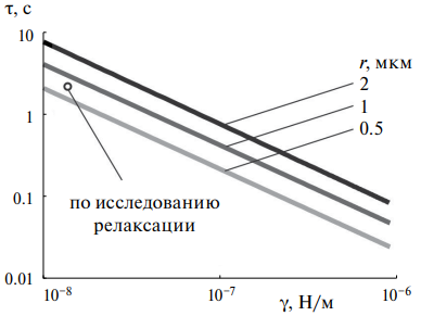 где — радиус капли эквивалентного объема, а — отношение вязкостей жидкостей внутри и снаружи капли. На рис. 5 в логарифмическом масштабе показан график расчетной зависимости характерного времени релаксации от величины межфазного натяжения для различных значений размера капли. Точка на графике обозначает время релаксации магнитооптического эффекта, полученное в эксперименте для капли эмульсии со средним размером 700 нм. Этому значению соответствует величина межфазного натяжения γ = 10−8 Н/м, что по порядку величины совпадает с используемым значением в расчетах для графиков 2 и 3. Величины межфазного натяжения, полученные из исследований процессов релаксации и из изучения статических эффектов в магнитном поле, дают несколько различающиеся значения, что можно объяснить ограниченностью возможности использования формул (5) и (6) для капель с высокой степенью деформации. Кроме того, при сильном вытяжении микрокапли могут принимать форму, отличную от эллипсоидальной, что также ограничивает возможности описания систем сильно деформированных капель на основе простых приближений. Вместе с тем, использование зависимостей, подобных изображенной на рис. 5, позволяет сделать оценку, в том числе, и температурной зависимости межфазного натяжения для микрокапель, для которой имеются противоречивые экспериментальные данные [15, 16].