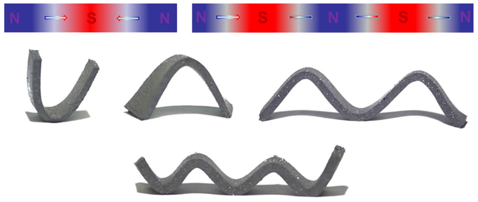 МАЭ может быть приготовлен с использованием магнитотвердого порошка. Такой материал может иметь широкую петлю гистерезиса после намагничивания и может использоваться как эффективный демпфирующий материал [15, 16, 17, 18]. Однако, такой материал может быть намагничен сложным образом, и полоска из такого материала может иметь множество полюсов. В магнитном поле он может деформироваться сложным образом как показано на рис. 2.