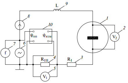 Рис. 1. Последовательный колебательный контур 1 — ячейка со слоем МДЖ, 2 — вольтметр, 3 — резистор (R1 = 100 Ом), 4 — шунт (RШ = 100 Ом), 5 — вольтметр, 6 — генератор переменной частоты, 7 — частотомер, 8 — постоянный источник ЭДС, 9 — катушки индуктивности с параметрами L = 2×0.11 Гн RL = 2×16 Ом, 10 — измеритель разности фаз.