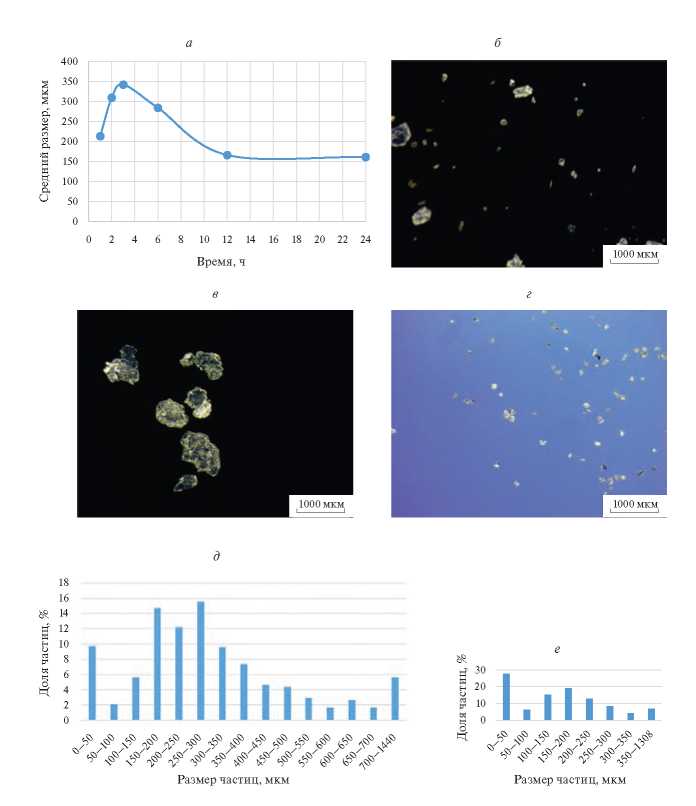 В результате проведенных экспериментов было установлено, что при увеличении времени помола с 1 до 24 ч наблюдается немонотонное диспергирование частиц, что наглядно показано на графике изменения среднего размера частиц от продолжительности помола (рис. 1а). После 1 ч размола средний размер частиц порошка составляет 213 мкм (рис. 1б), затем после 2–3 ч происходит укрупнение частиц за счет их агломерации до 309 мкм (рис. 1в), а далее после 12 ч агломераты разбиваются и измельчаются до среднего размера 166 мкм. При дальнейшем увеличении времени помола с 12 до 24 ч средний размер частиц порошка не меняется и составляет 161 мкм (рис. 1г).