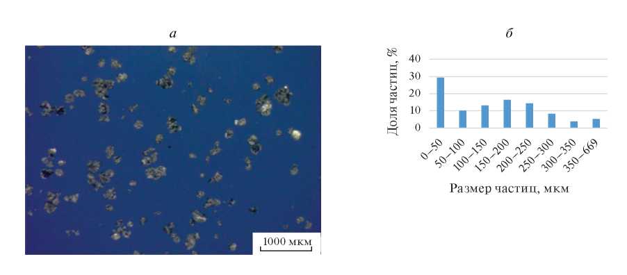 Рис. 2. Порошок, полученный при двухступенчатом размоле 24+6 ч, и после просеивания: частицы порошка (а); гранулометрический состав (б).