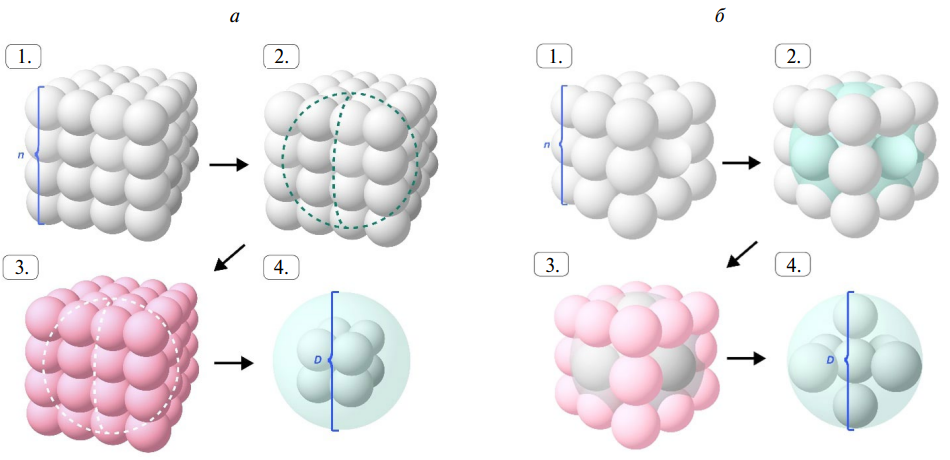 Формирование МГЧ осуществляется по следующему принципу: простая кубическая решетка с ребром, состоящим из n гранул, помещается в сферу диаметра D = dn, центр которой совпадет с центром выбранной решетки. Все гранулы, не попавшие целиком внутрь сферы, отсекаются. В случае, когда n является нечетным, центр кубической решетки совпадает с центром гранулы. Подобное формирование частицы приводит к тому, что внутри сферы остается нечетное количество гранул. Системы с подобной архитектурой в дальнейшем будут называться нечетными, в противном случае будем говорить, что система является четной. Процесс формирования МГЧ наглядно показан на рис. 1.