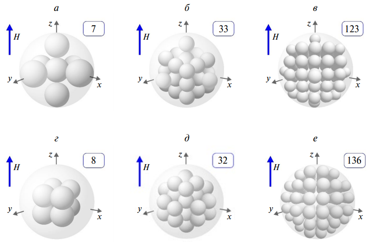 Рис. 2. Внутренняя структура исследуемых многогранульных частиц. Случай 7 (а), 33 (б) и 123 (в) гранул, размещенных в узлах кубической решетки, с гранулой, размещенной в центре частицы; случай 8 (г), 32 (д) и 136 (е) гранул, размещенных в узлах кубической решетки, центр которой совпадает с центром частицы. Во всех случаях внешнее магнитное поле приложено вдоль оси Oz.
