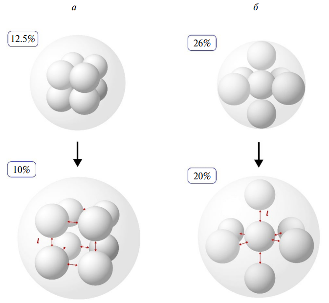 Как видно из данных, приведенных в табл. 1, описанный выше алгоритм построения моделей приводит к формированию систем с высокой объемной концентрацией φ, которая растет с увеличением числа гранул, расположенныхв МГЧ. Изменения объемной концентрации в различных образцах делают сравнительный анализ менее объективным, чем сопоставление систем с одинаковой концентрацией. Простейшим способом понижения объемной концентрации и «выравнивания» МГЧ по концентрации является увеличение расстояния между гранулами и переход от плотного контакта к случаю равноудаленных гранул. Процесс преобразования моделей наглядно показан на рис. 3.