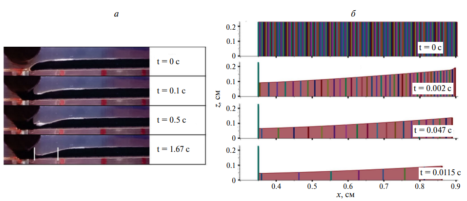 Рис. 2. Формы слоя МЖ разные моменты времени t при H∞ = 400 Э: эксперимент l = 4.54 см (а); расчет для экспериментальных параметров (б).