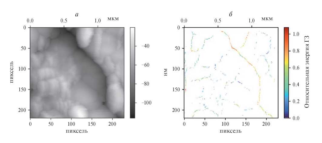 Рис. 3. Фрагмент СТМ-снимка поверхности травления УМЗ никеля, полученного СВД на 5 оборотов (а) и карта относительных зернограничных энергий, полученных с применением алгоритмической обработки с условием r2 > 0.9 (б)