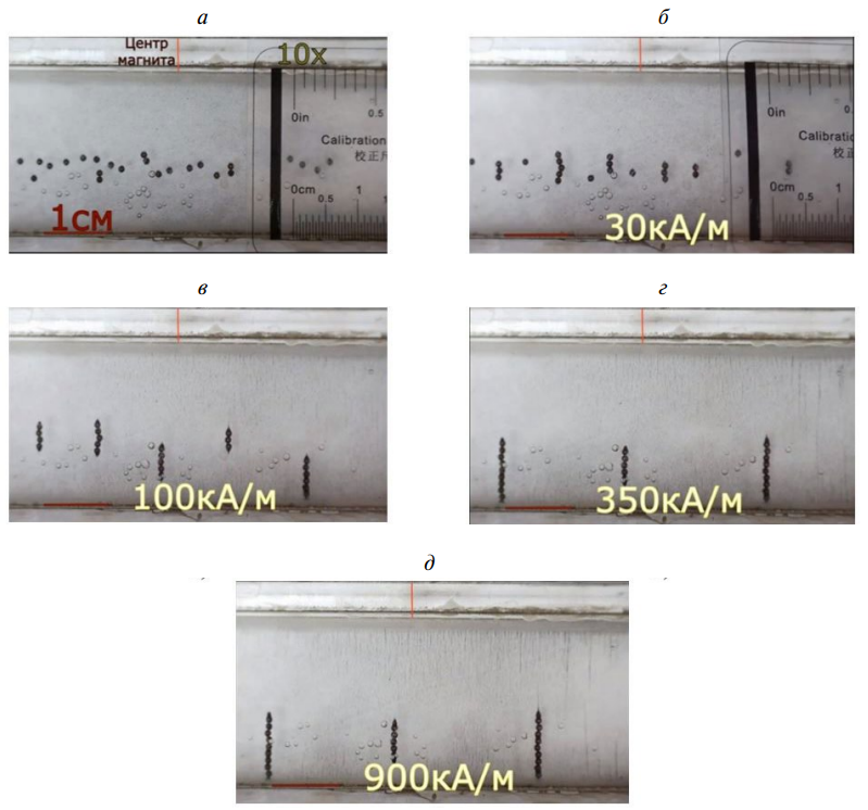 На рис. 4 представлено образование цепочечных структур при линейном распределении шариков. При включении магнитного поля частицы приходят в движение, начинают упорядочиваться шарики (рис. 4б), выстраиваясь в цепочки по два-три шарика. Затем (рис. 4в) выстраиваются мелкие частицы, происходит присоединение их к шарикам. На рис. 4г мелкие частицы выстроились в цепочки, мелкие цепочки из маленьких частиц объединяются в длинные, шарики образовали три цепочки — две содержат по 10 шариков и одна в центре состоит из 5 таких шариков. Рис. 4д показывает, что упорядочивание завершено. В данном эксперименте не происходит изменения числа цепочек в диапазоне увеличения напряженности магнитного поля от 400 до 1000 кА/м (рис. 5).
