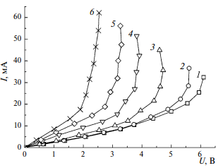 Рис. 3. ВАХ (Fe, Sc)-замещенного манганита при различных температурах: 1—130 K; 2—140 K; 3—160 K; 4—180 K; 5—200 K; 6—240 K.